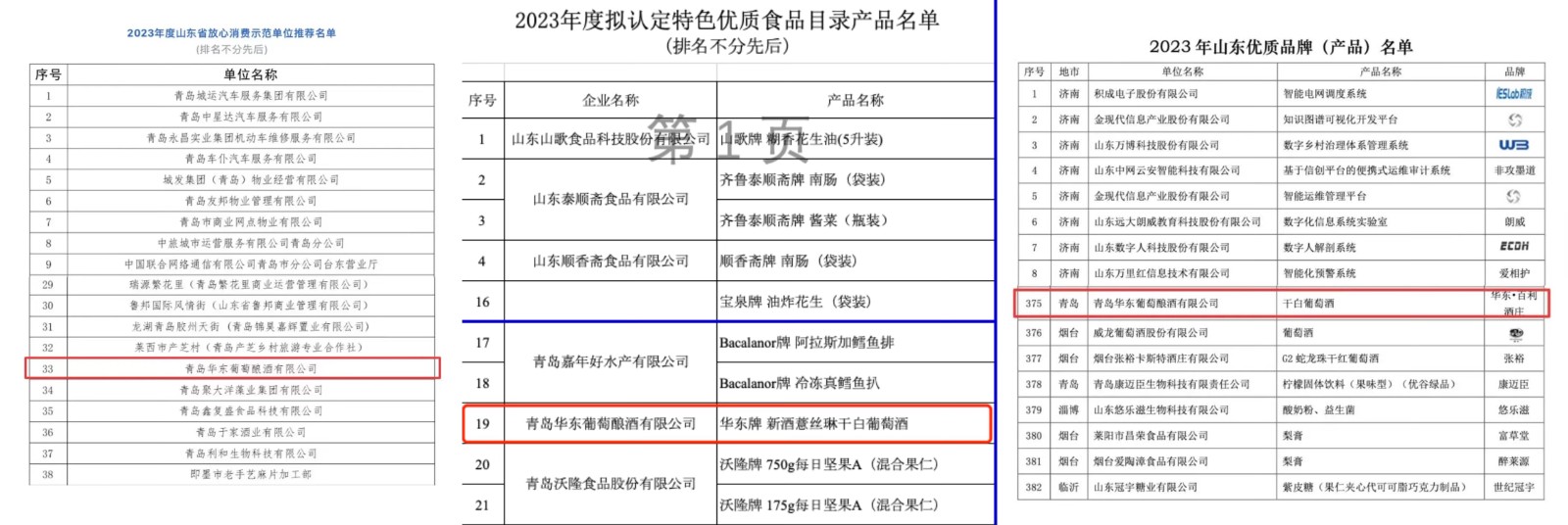 ,华东葡萄酒屡获殊荣,成绩斐然,分别荣获2023年度山东省放心消费示范单位、2023山东省特色优质食品目录产品、2023年山东优质品牌(产品)多项殊荣。