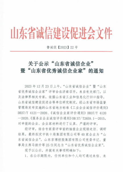 2023年12月25日,“山东省诚信企业暨山东省优秀诚信企业家”评审会在济南召开。源水集团所属青岛董家口经济区供水有限公司在本次评选中喜获佳绩,荣获“山东省诚信企业”称号。